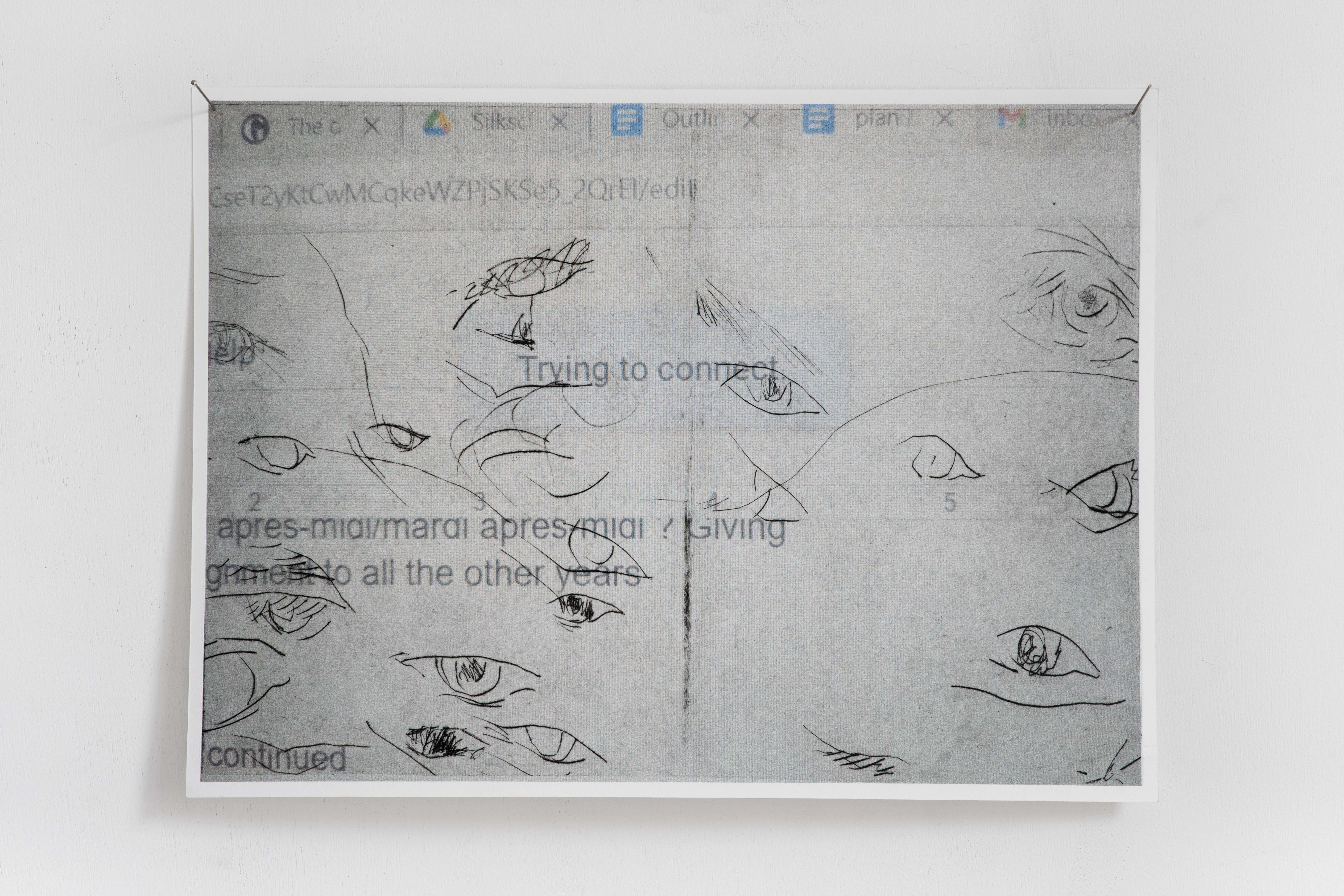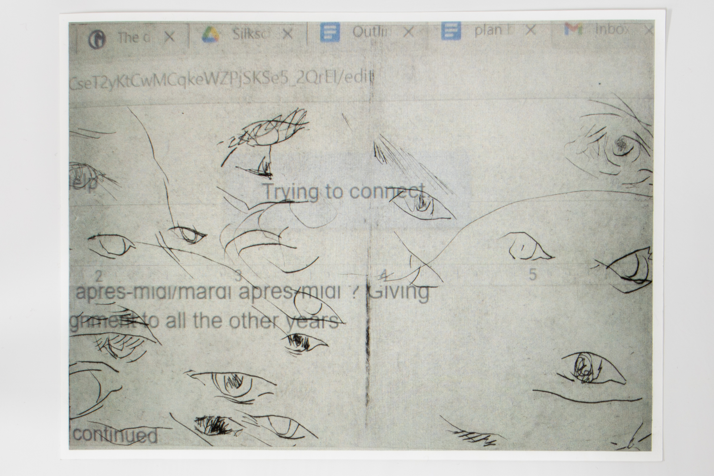 Trying to connect, print made with bent plexiglass and a chinecollé screengrab, 20,5x28cm, 2025