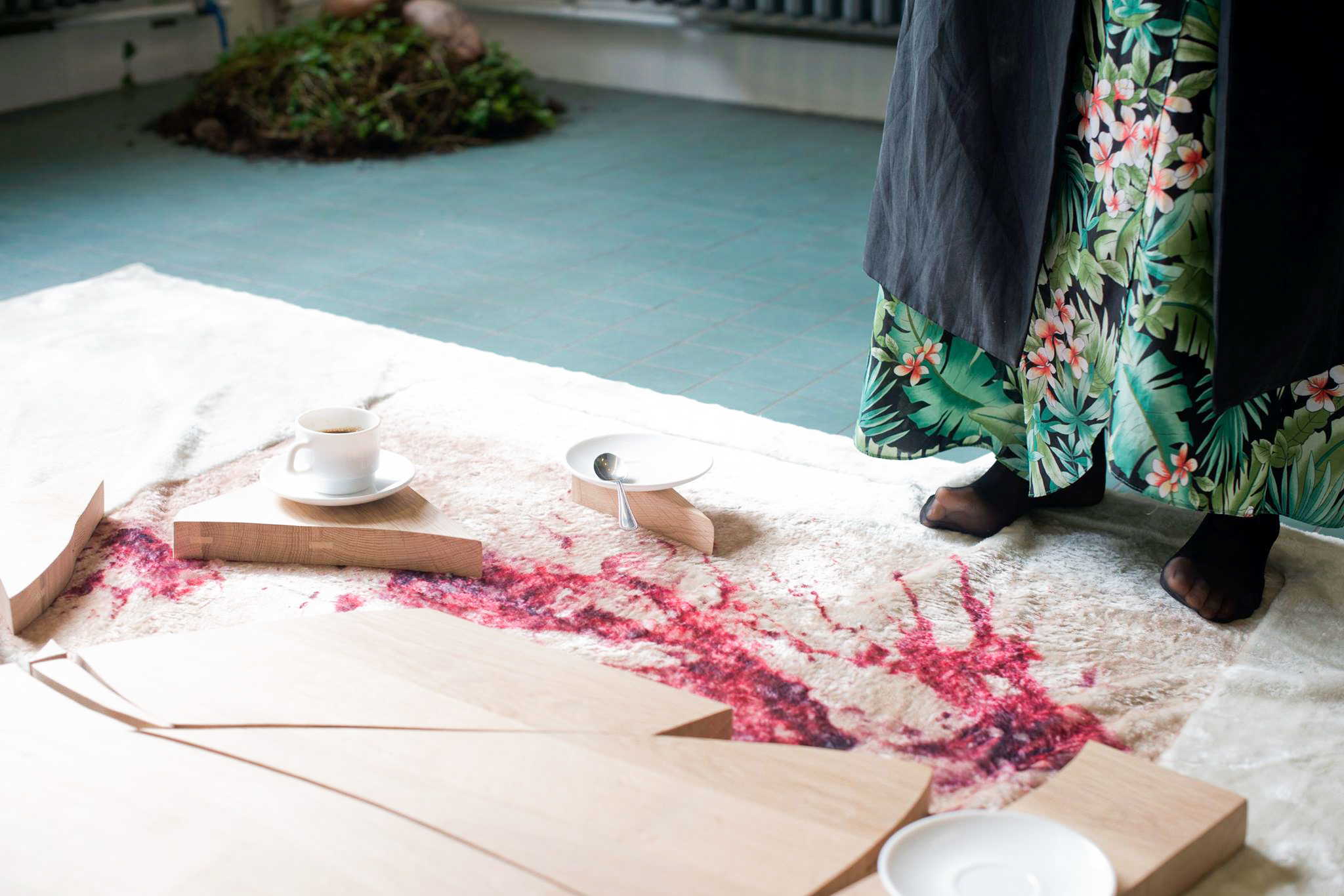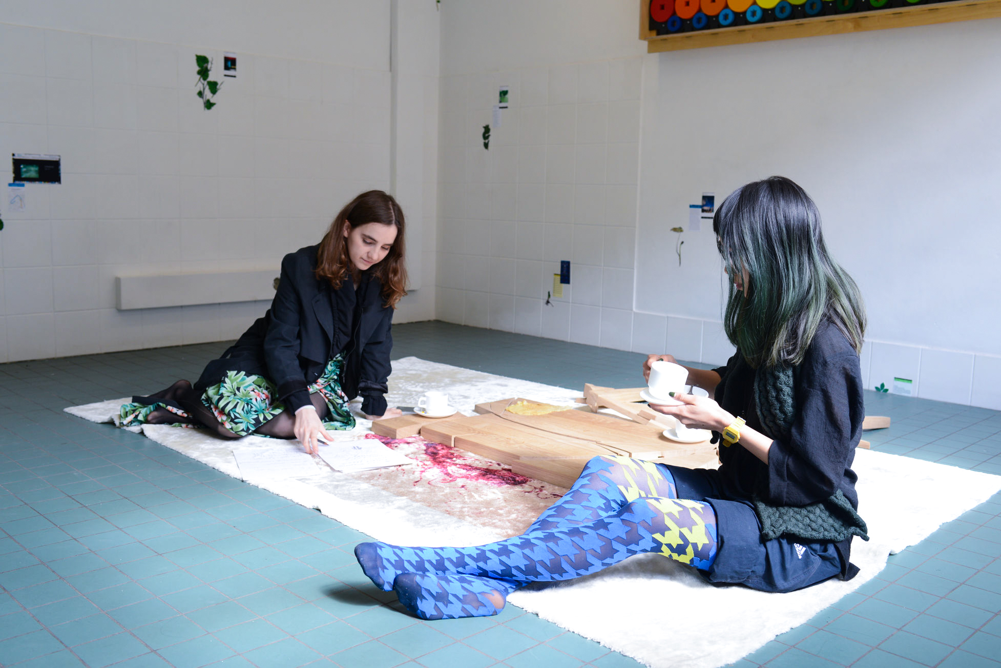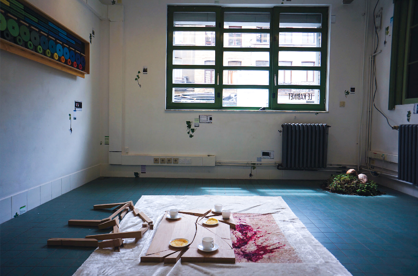 Installative environment, a living room made of artworks, with screengrab wallpaper, oncology tea cups and printed biscuits, in collaboration with Weixin Quek Chong.