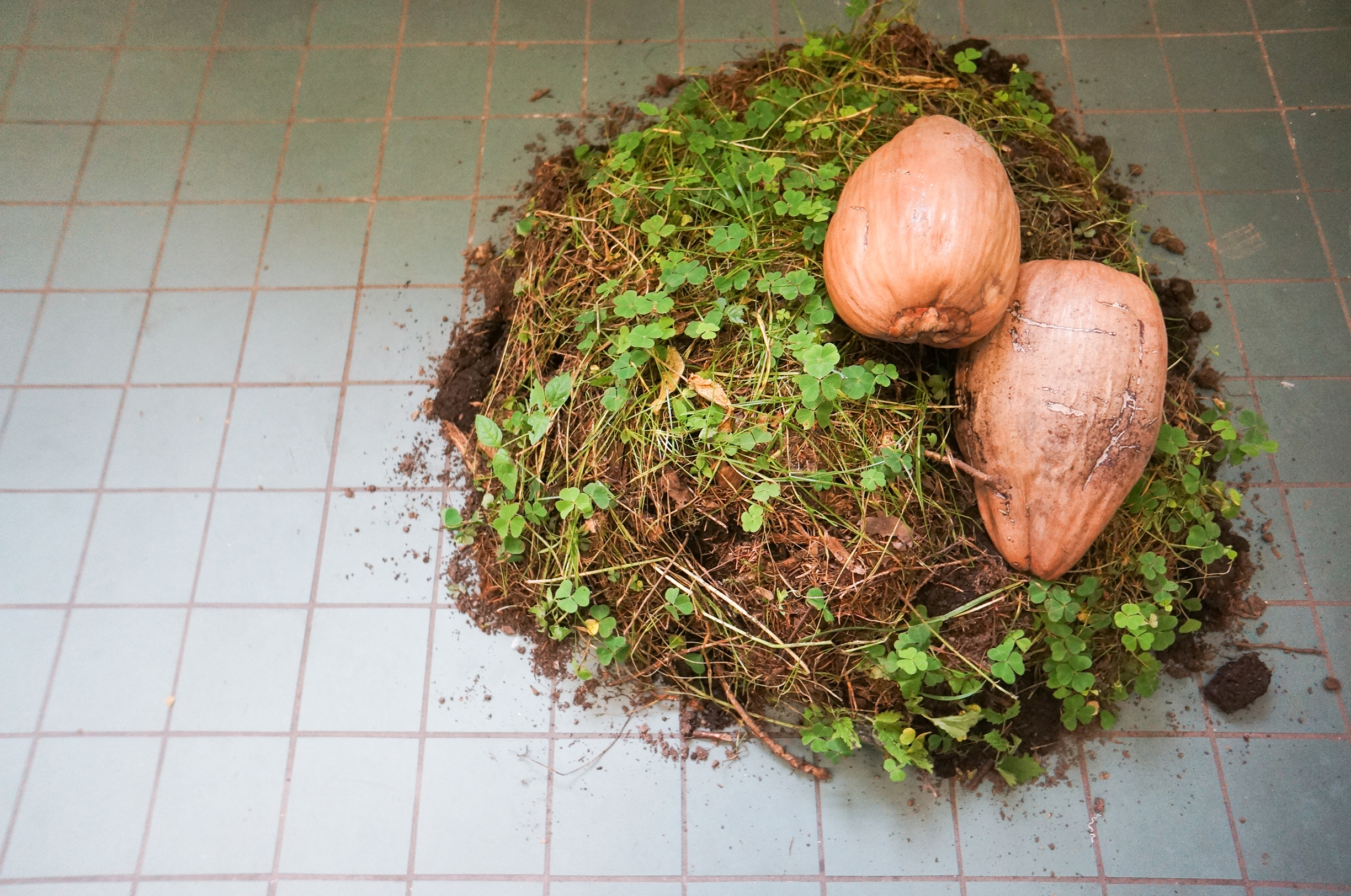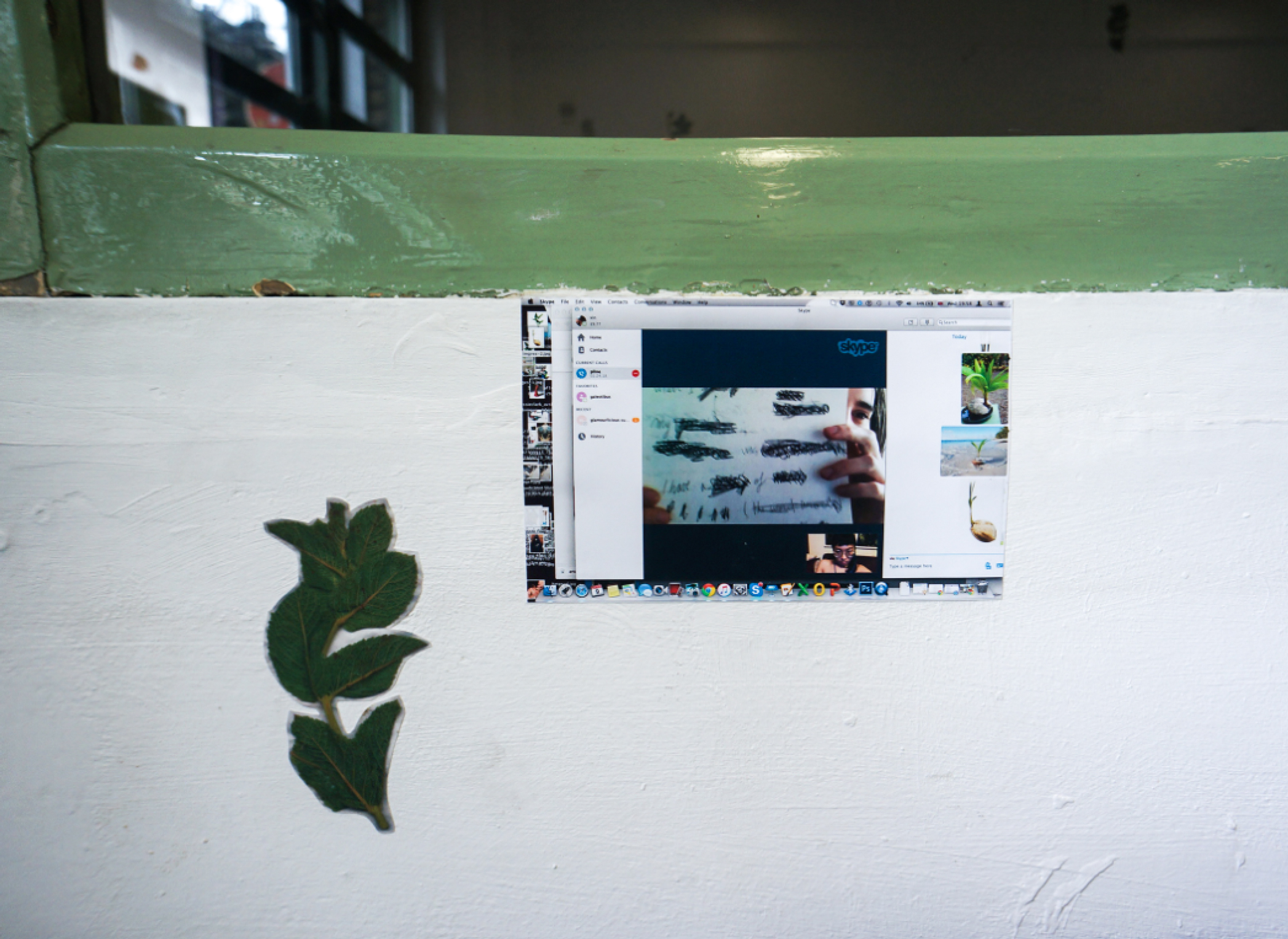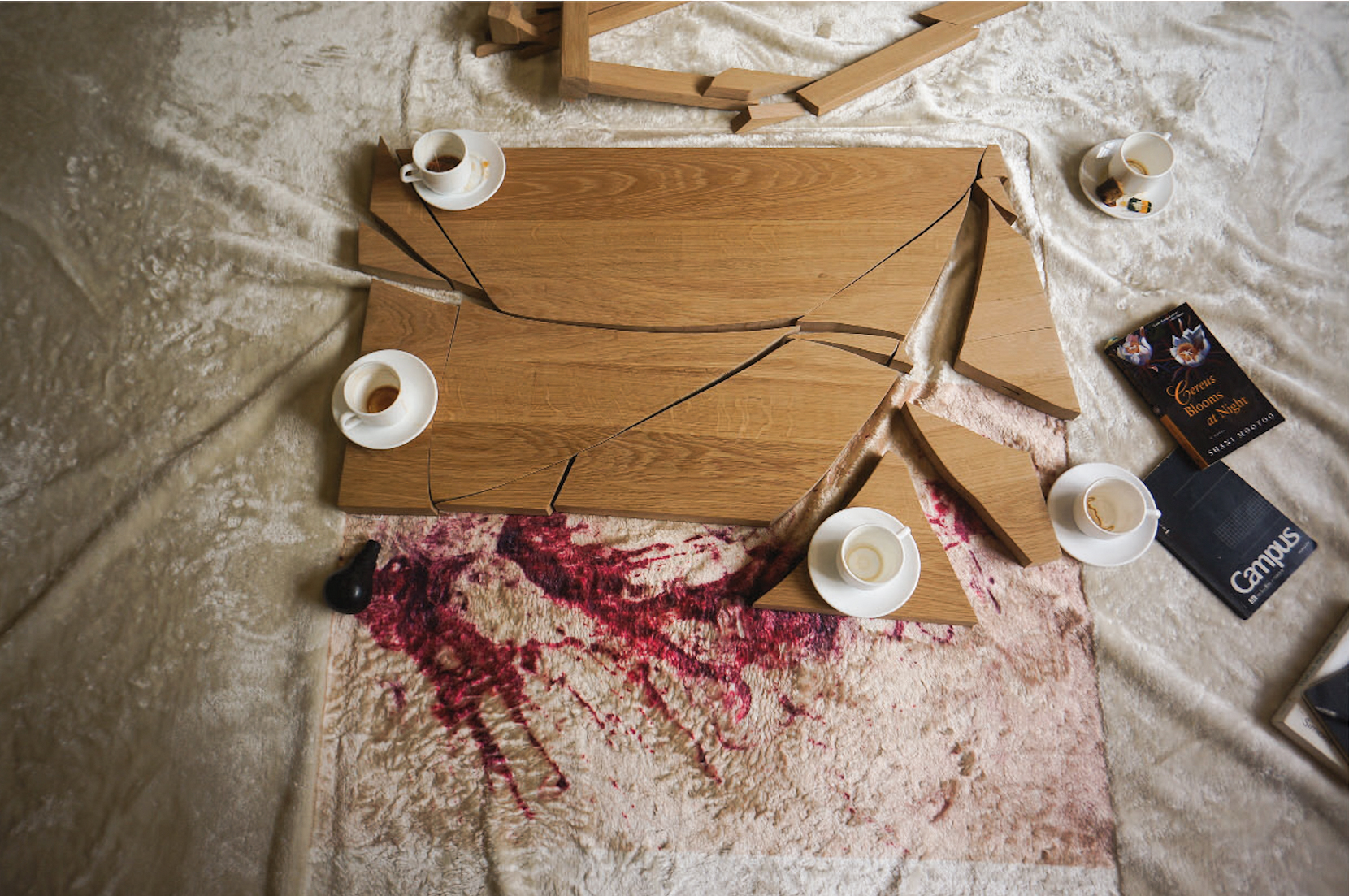 Installative environment, a living room made of artworks, with screengrab wallpaper, oncology tea cups and printed biscuits, in collaboration with Weixin Quek Chong.